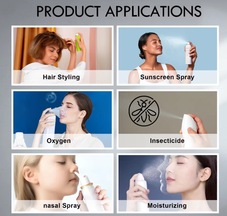 3-Aplicado em vários produtos, como espuma de barbear, spray para cabelo, spray desodorante, purificador de ar, spray de óleo de cozinha, tinta spray, spray de agente de limpeza, gás butano, spray antimosquito, spray refrescante etc.
